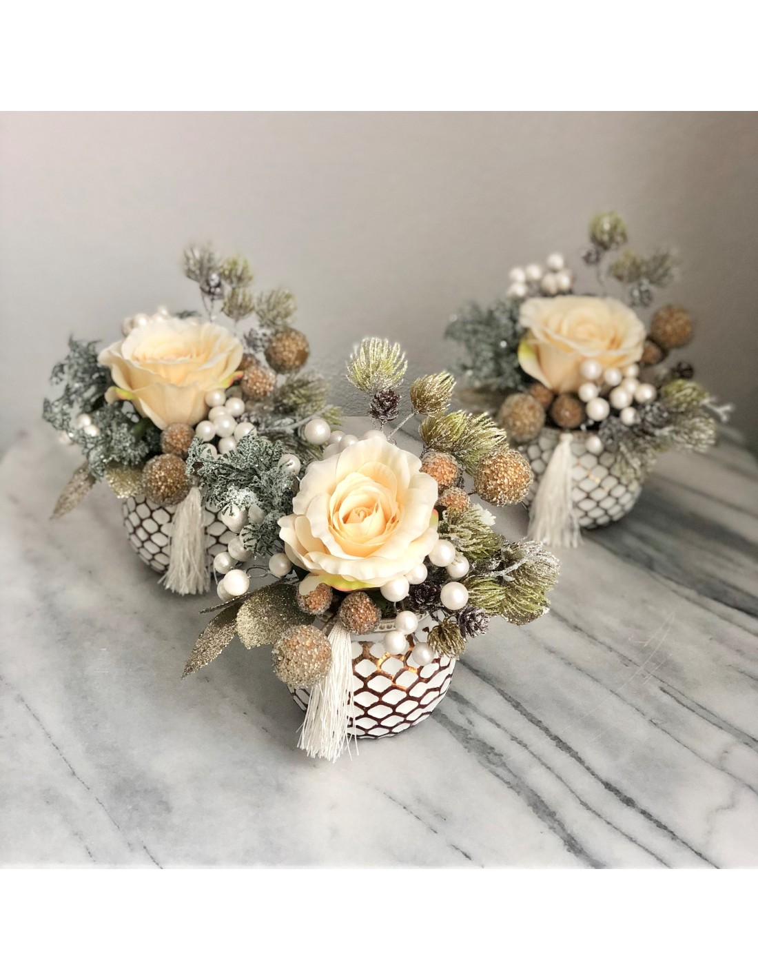 Das Arrangement hat eine Höhe von ca. 21 cm, Gesamtdurchmesser von ca. 18 cm.
