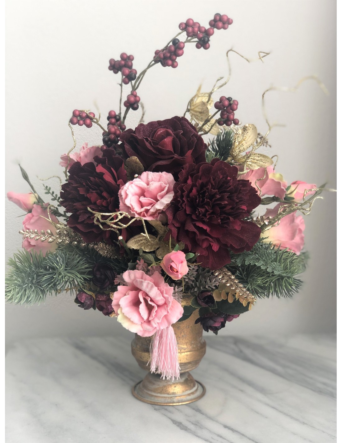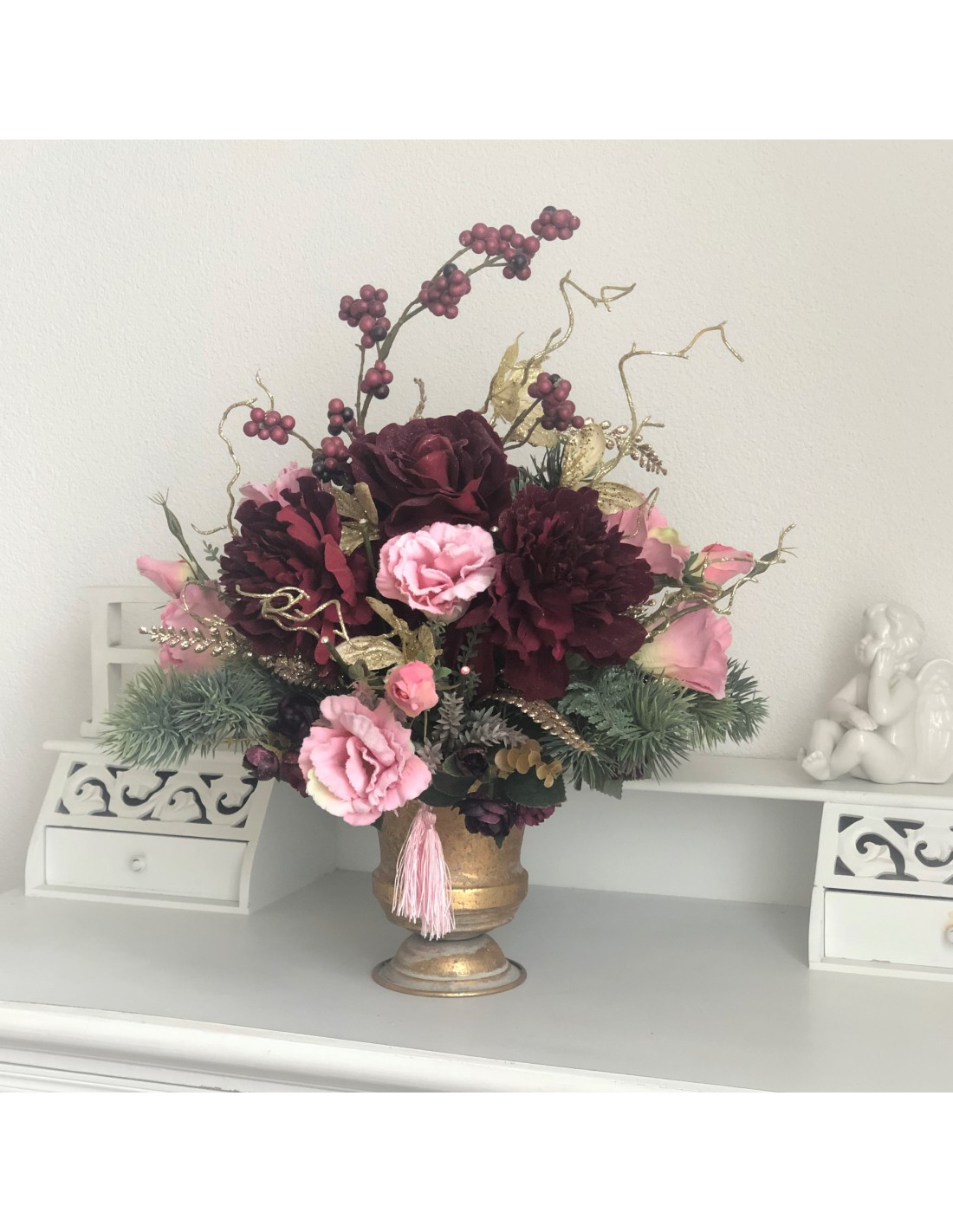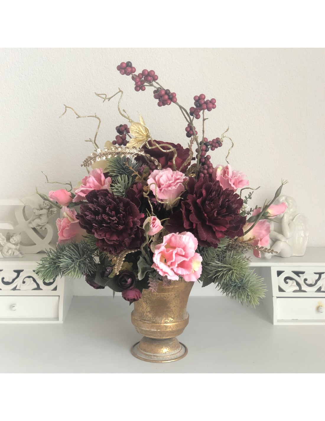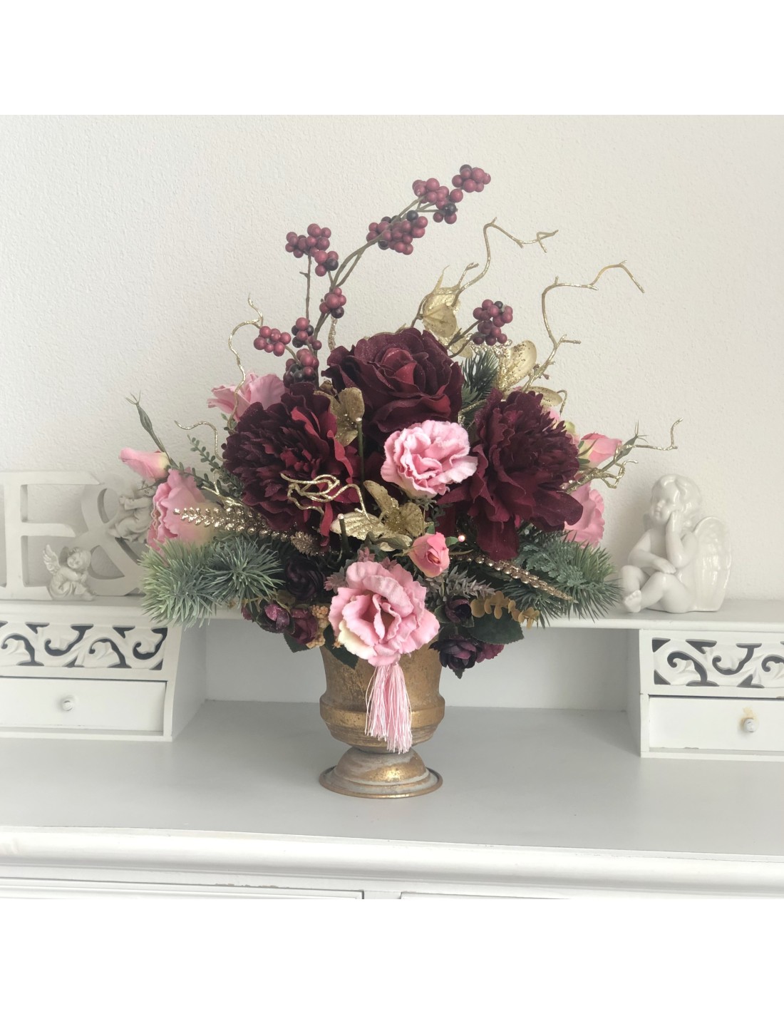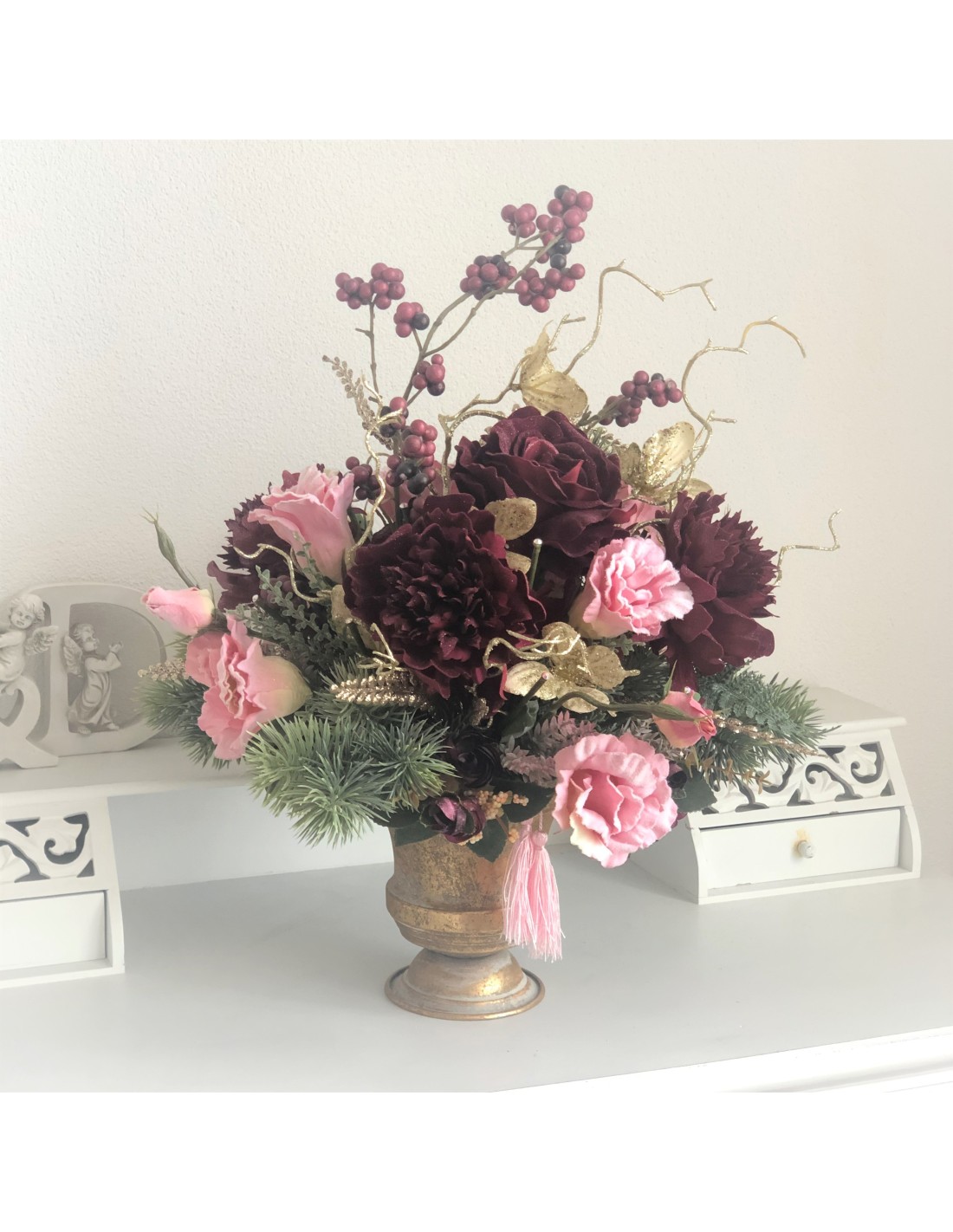Das Arrangement hat eine Höhe von ca. 54 cm, Gesamtdurchmesser von ca. 45 cm.In einem runden Gefäß Aluminium Gold angefertigtes Seidenblumengesteck mit verschiedenen Rosenblüten, Eustomas, Peonies, Beiwerk und unterschiedlichen Gräsern.Unsere Seidenblumen-Gestecke sind individuell angefertige Einzelstücke und können auch nur einmal genau in dieser Art zu bestellt werden. Auf Wunsch fertigen wir Ih