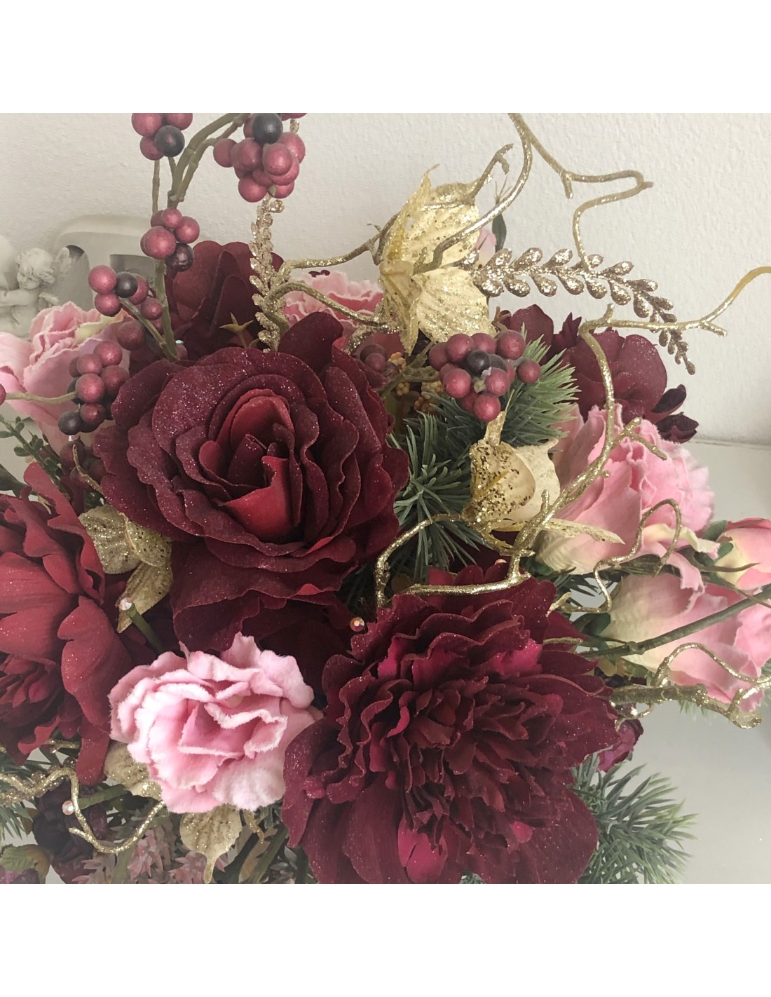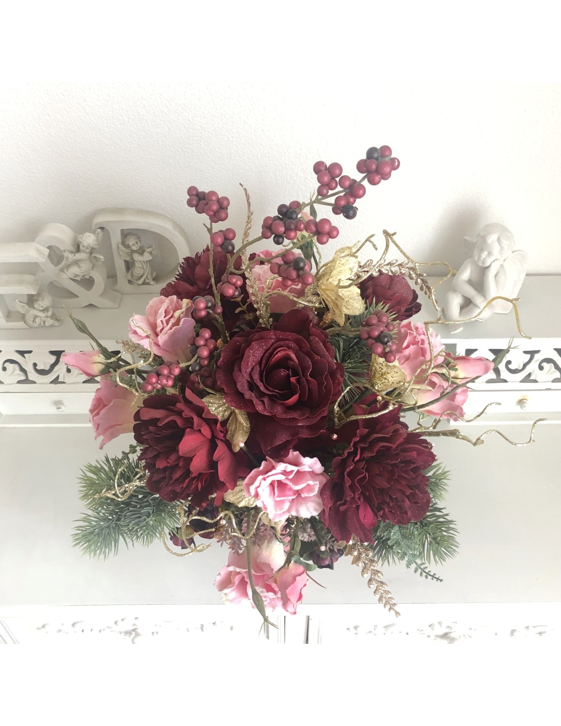 Das Arrangement hat eine Höhe von ca. 54 cm, Gesamtdurchmesser von ca. 45 cm.