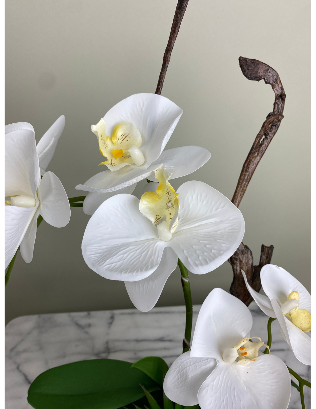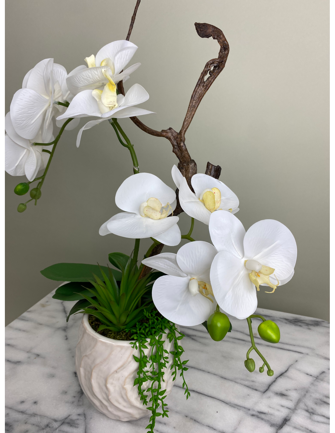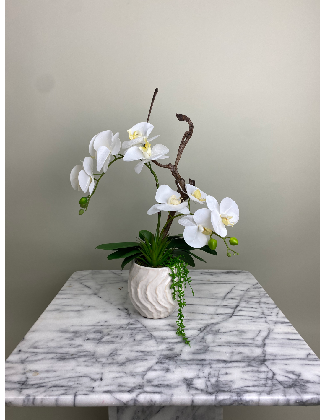 Diese edle künstliche Orchidee beeindruckt durch ihre realistisch gearbeiteten weißen Blüten und die frischen grünen Blätter. Ein dekorativer Natur-Stock verleiht dem Arrangement eine besonders stilvolle und authentische Note. Der strukturierte Keramiktopf rundet das Gesamtbild ab und macht diese Orchidee zu einem luxuriösen Blickfang in jedem Raum.