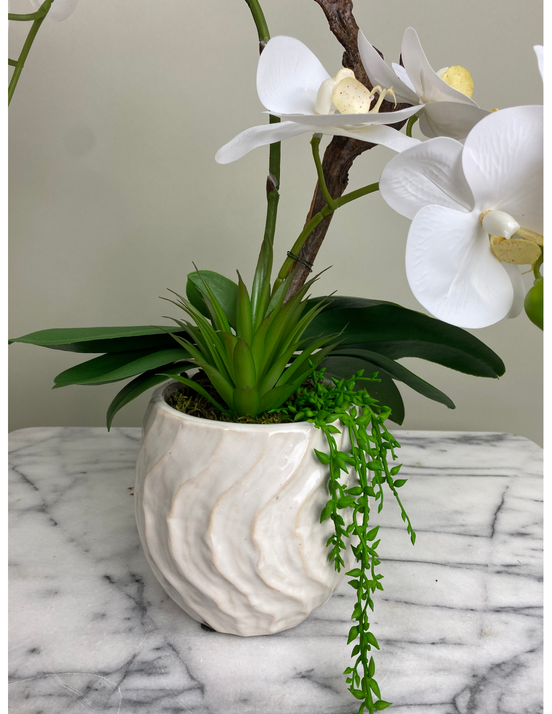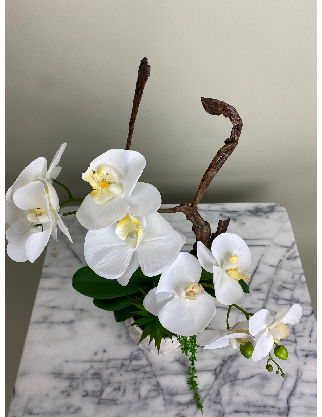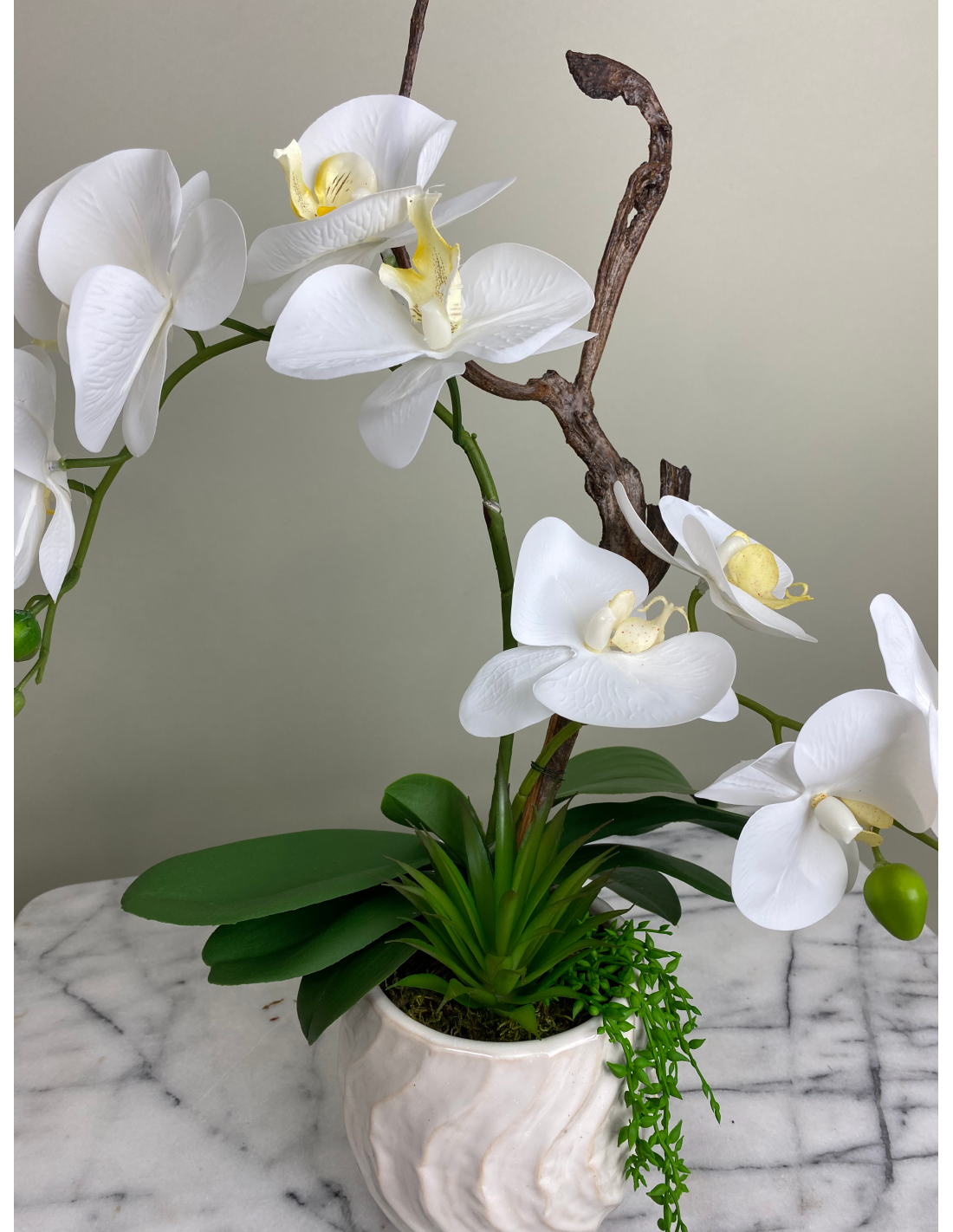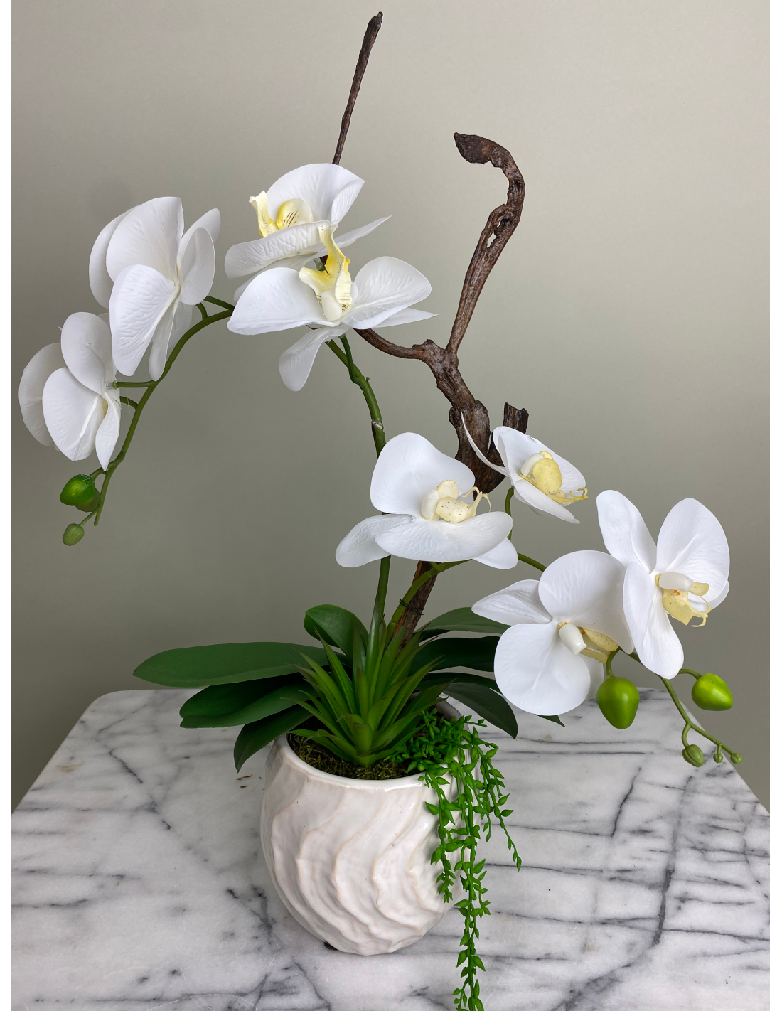 Diese edle künstliche Orchidee beeindruckt durch ihre realistisch gearbeiteten weißen Blüten und die frischen grünen Blätter. Ein dekorativer Natur-Stock verleiht dem Arrangement eine besonders stilvolle und authentische Note. Der strukturierte Keramiktopf rundet das Gesamtbild ab und macht diese Orchidee zu einem luxuriösen Blickfang in jedem Raum.