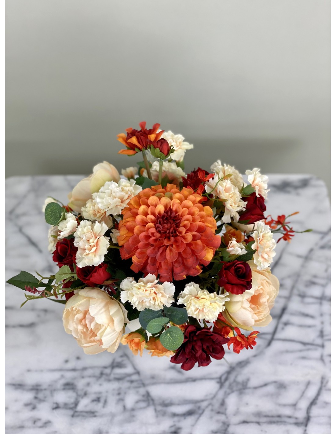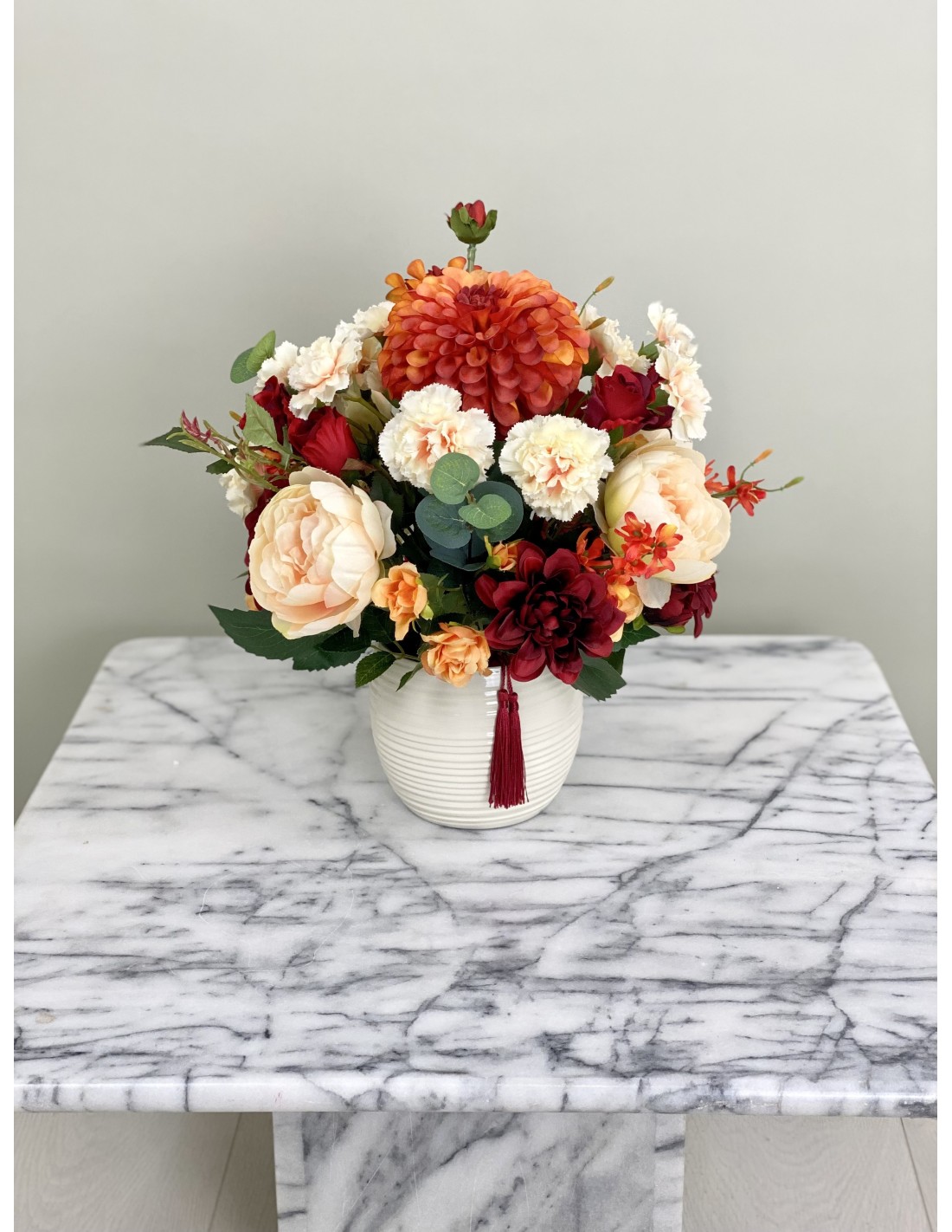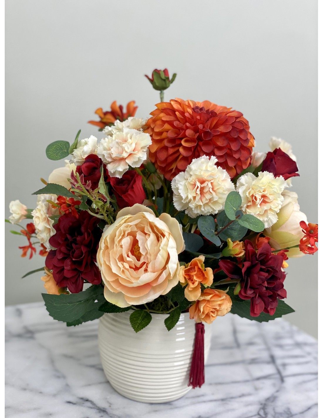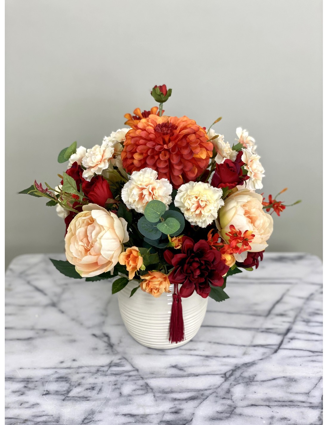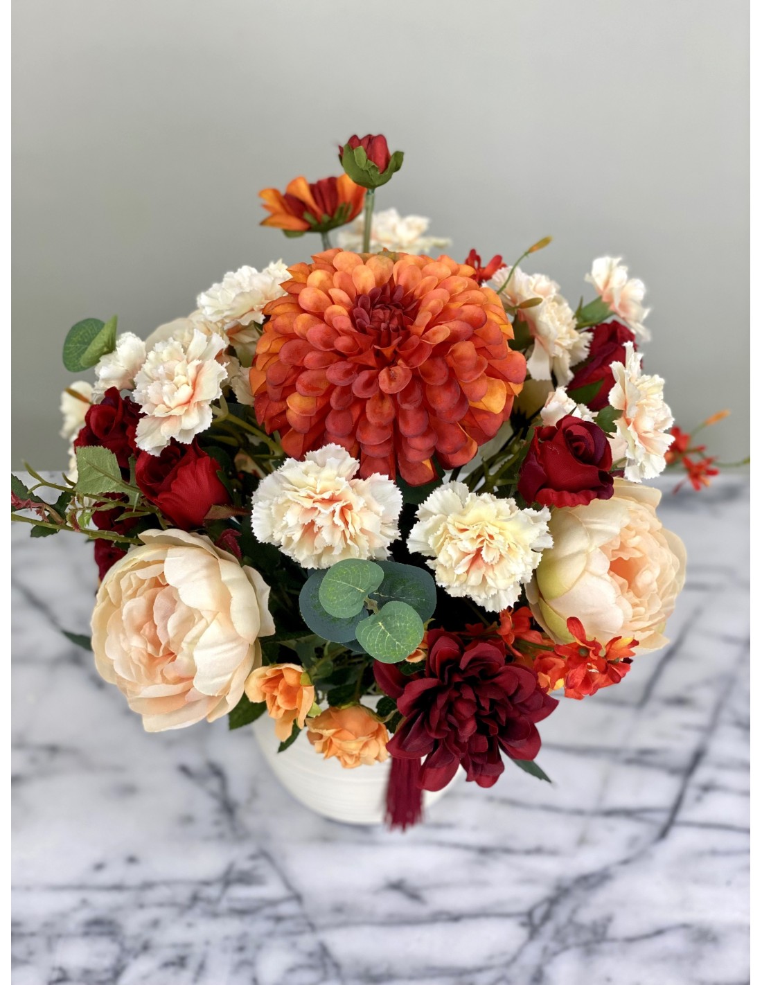 In einem runden Keramikgefäß angefertigtes Seidenblumengesteck mit verschiedenen Chrysanthemen, Nelken, Rosen, Beiwerk und unterschiedlichen Gräsern.