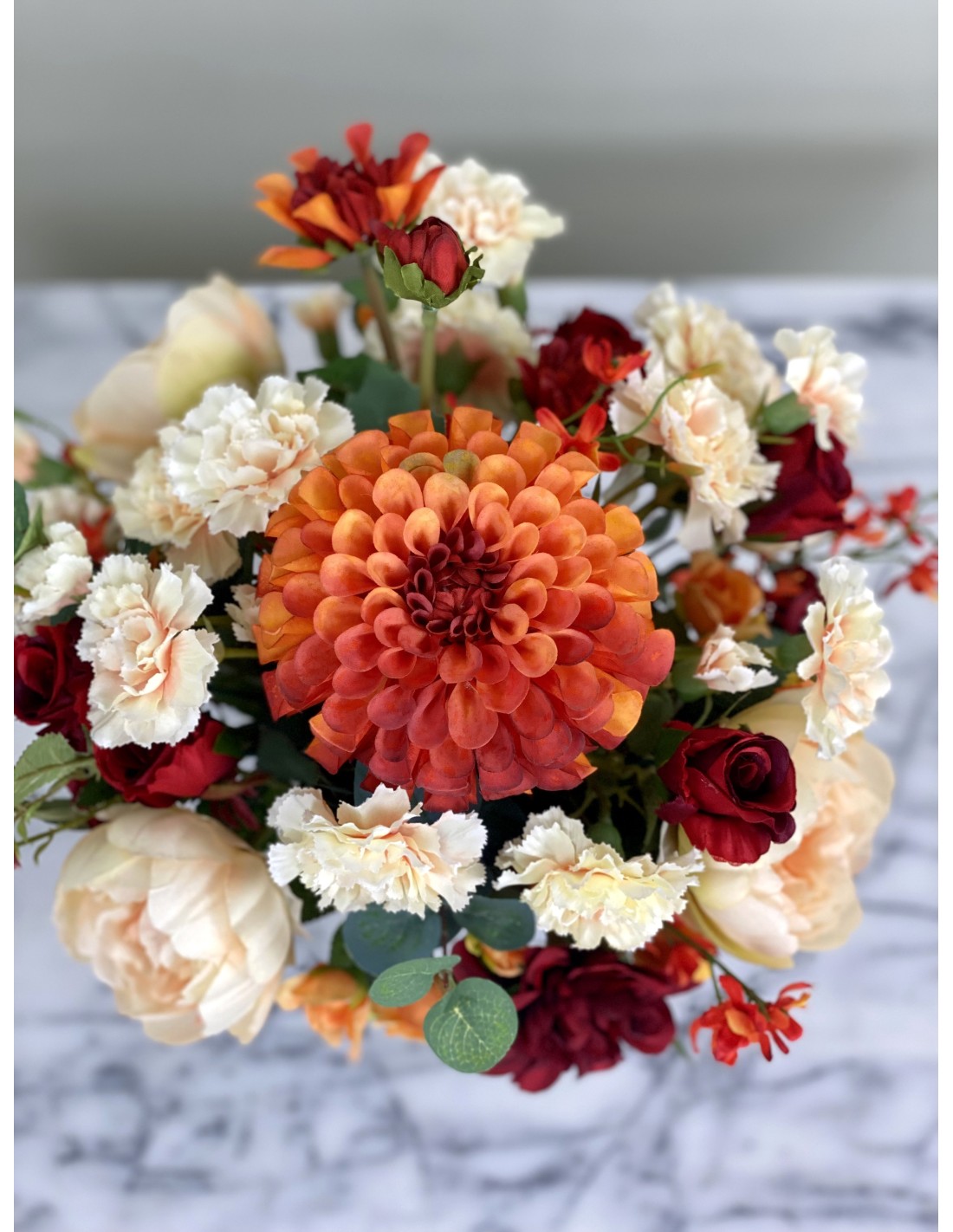 Das Gesteck hat eine Höhe von ca. 34 cm, Gesamtdurchmesser von ca. 31 cm.