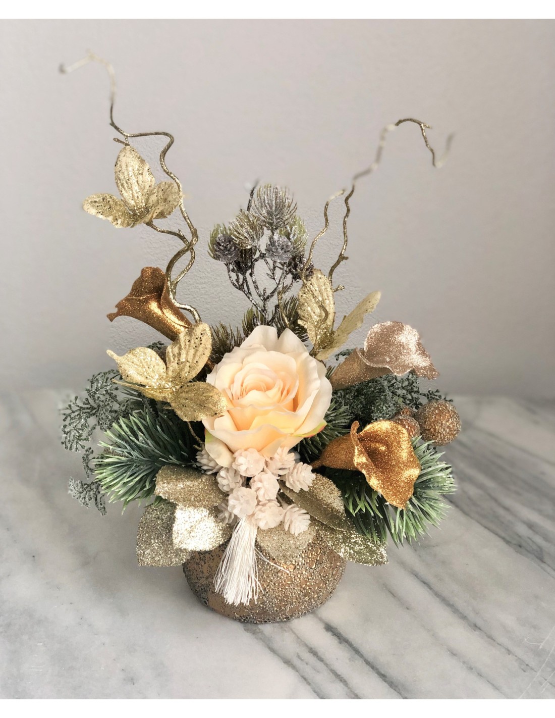 Das Arrangement hat eine Höhe von ca. 35 cm, Breite von ca. 25 cm.Dieses Weihnachtsarrangement mit seinen verschiedenen Weihnachtsmaterialien zaubert jedem großen Fest eine besondere Atmosphäre. Das Arrangement besteht aus Kunstmaterialien und ist mit dekorativen Kugeln, Zweigen, Beeren, Rose und Callas sowie mit Tannenzapfen geschmückt.