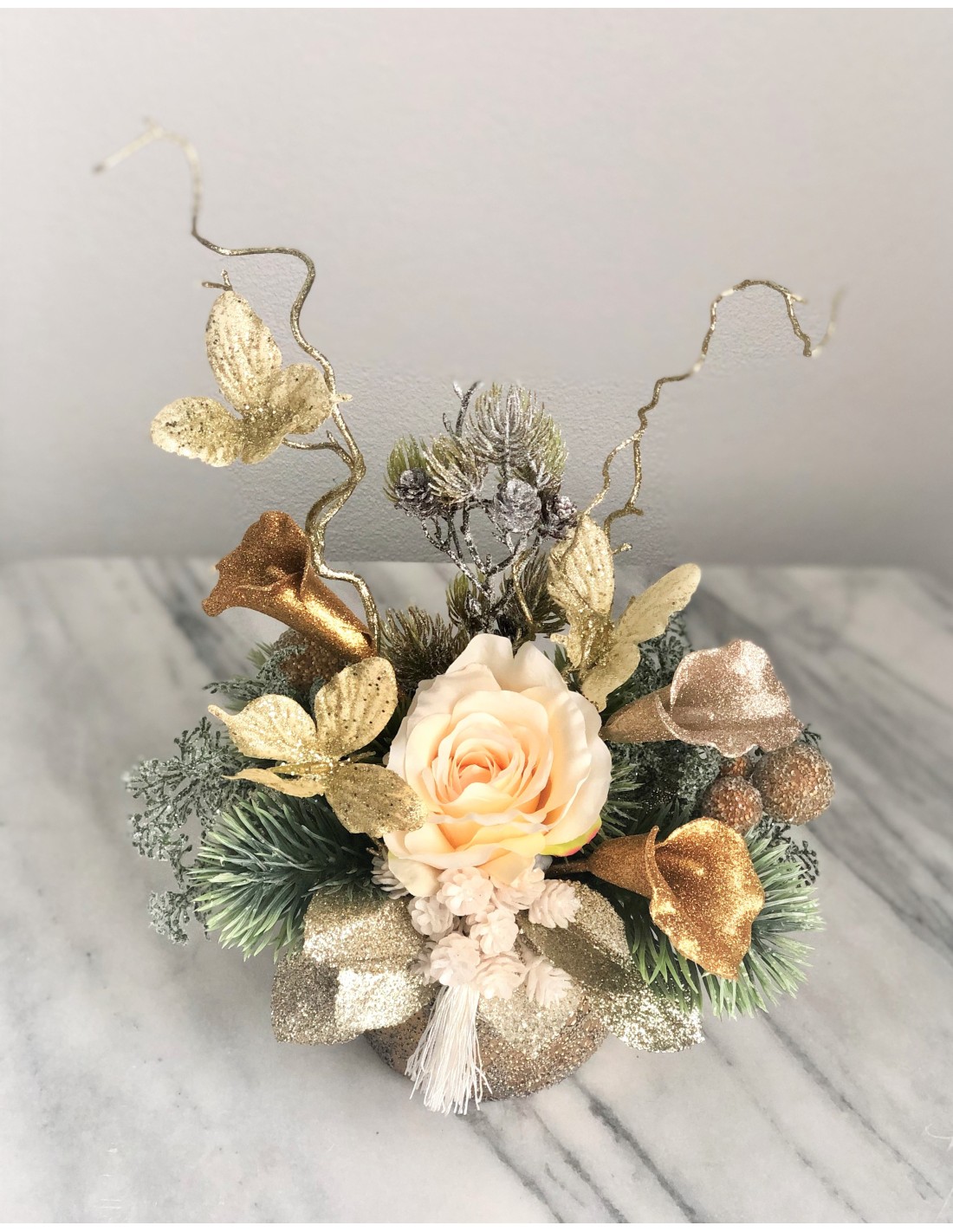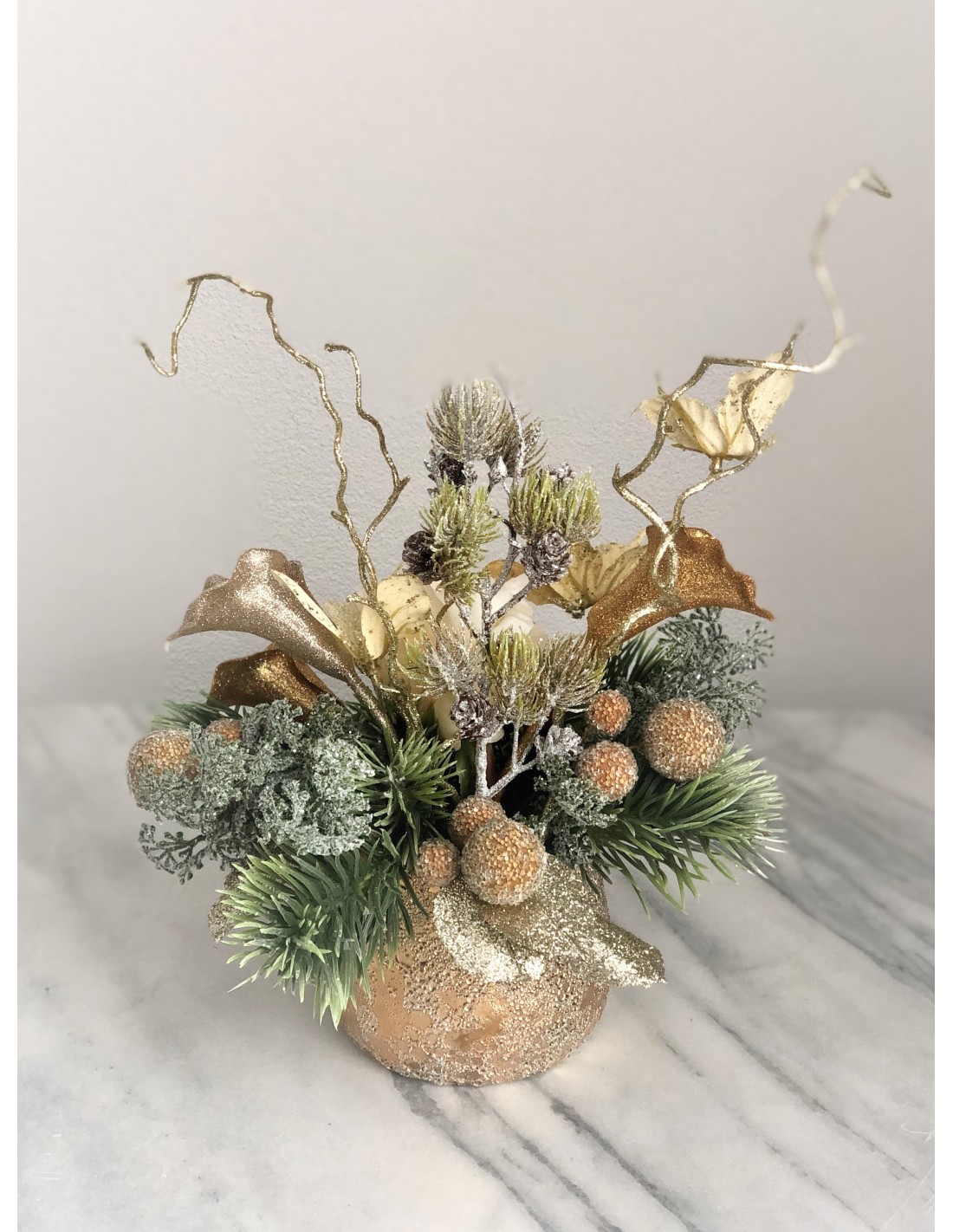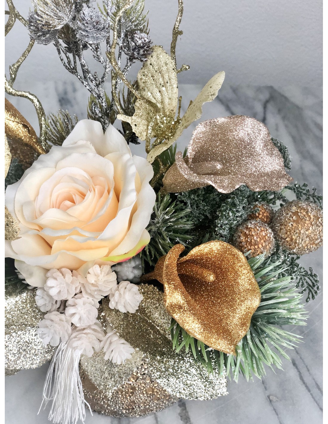 Dieses Weihnachtsarrangement mit seinen verschiedenen Weihnachtsmaterialien zaubert jedem großen Fest eine besondere Atmosphäre. Das Arrangement besteht aus Kunstmaterialien und ist mit dekorativen Kugeln, Zweigen, Beeren, Rose und Callas sowie mit Tannenzapfen geschmückt.